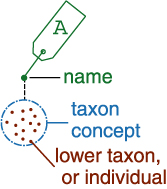 Taxonomic naming deconvolves into three encapsulating components: the instances (specimens or lower taxa) are encapsulated within a taxon concept (circumscription) which unites them and which is, in turn, encapsulated by the name itself, which provides a tag (A).