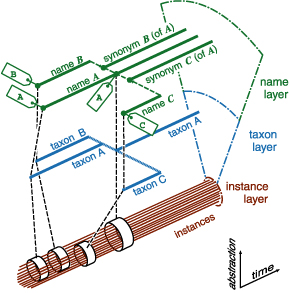 The three layers are drawn out into a temporal span to indicate the relationship between the names A, B and C. The information link from a specific publication is shown by a broken line. Existence is shown by solid horizontal lines. Instances are shown by a bundle of horizontal lines. It is important to note that there are no links between the taxon, name and instance except through publications. Taxon A was first described. Taxon B was a later description made in ignorance of taxon A, so is erroneous (a clerical error). Taxon C was described later still with new instances and proposed removing some of the instances from A, so re-defining the taxon concept of A. This represents multiple taxonomic opinion. A later reviser took the view that the division of A and C was unjustified and declared C to be a junior synonym of A, but with an emended definition of the taxon concept A. After this only a single taxon thread (A) continues, whereas in the name layer, the names B and C continue to exist as junior synonyms of A. Note that the figure shows only one opinion. Other opinions, with different arrangement of taxon lines, are also possible.