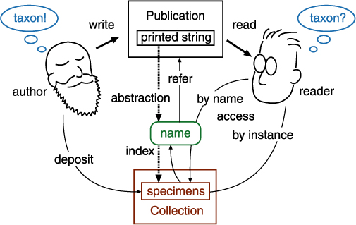 An author proposes a taxon by studying a number of its instances including specimens (if the taxon is a species or lower) or lower taxa (for taxon higher than species). The author gives a name to the taxon and the name appears printed in a publication. A reader of the publication, who may be reading it long after the death of the author, finds the printed name. The description in the publication is an abstract form of the original taxon concept (left oval) that the author had in mind when the manuscript was written. The description is not a taxon concept itself. There is no direct link between the taxon concepts of the author and the reader (right oval), hence there is no way to verify that these two concepts are identical, even if they are considering the same physical specimens.